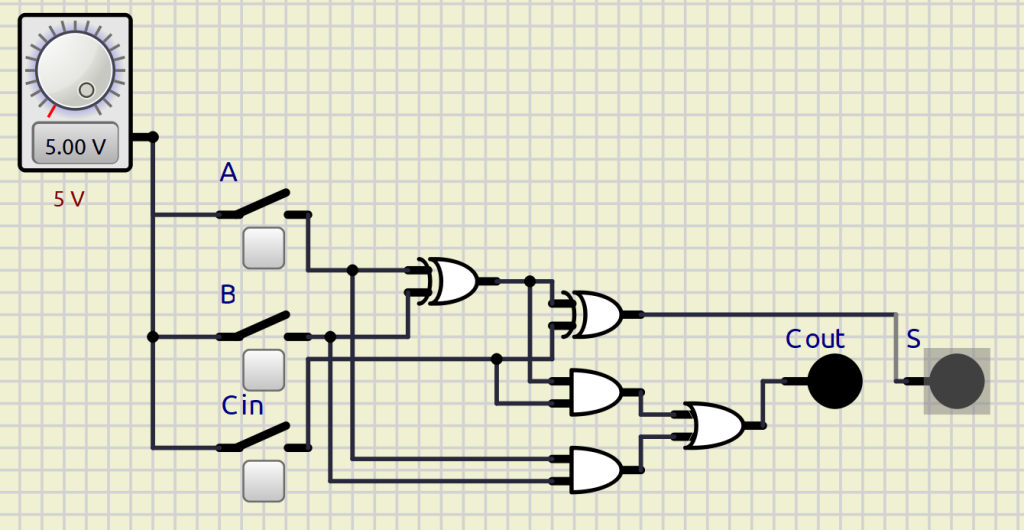 На выходе получаем два бита S и Cout, где S — это младший бит суммы, а Cout — бит переноса.
