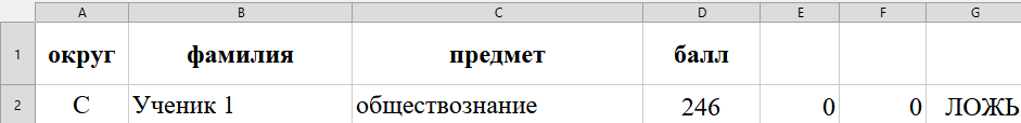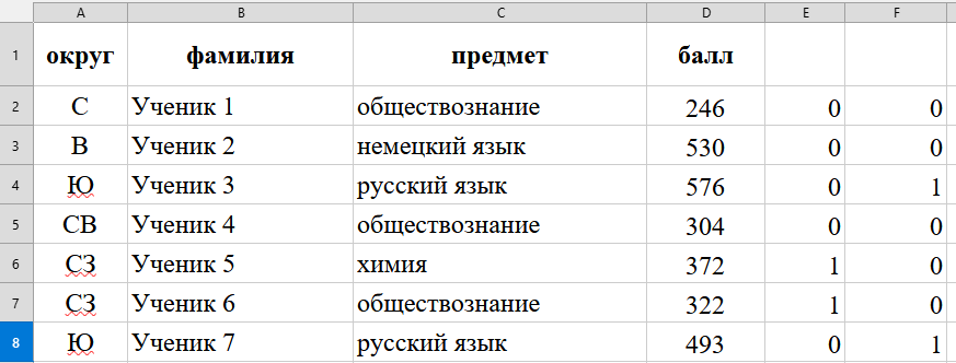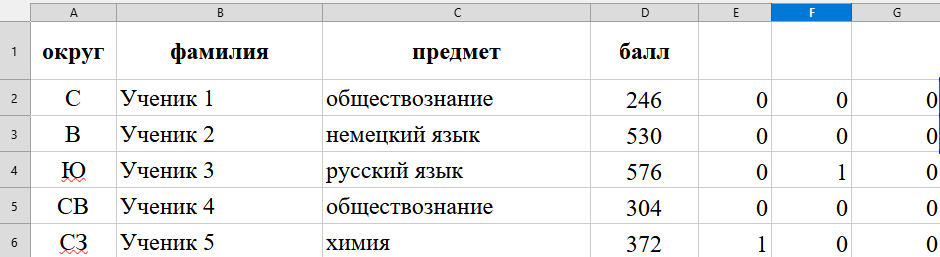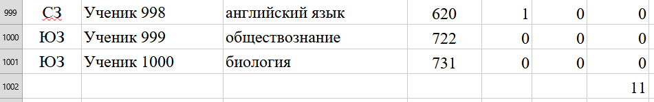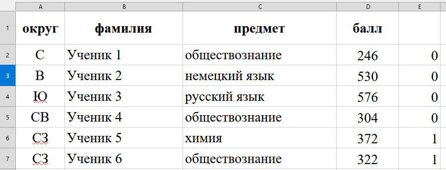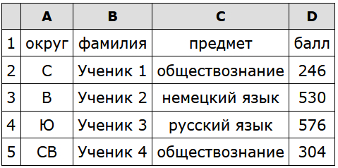 В столбце А записан округ, в котором учится ученик; в столбце В  — фамилия; в столбце С  — любимый предмет; в столбце D  — тестовый балл. Всего в электронную таблицу были занесены данные по 1000 ученикам.