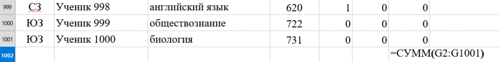 Используем функцию СУММ(G2:G1001) для того, чтобы просуммировать значения