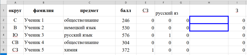 1.  Сколько учеников в Северо-Западном округе (СЗ) выбрали в качестве любимого предмета русский язык? Ответ на этот вопрос запишите в ячейку Н2 таблицы.