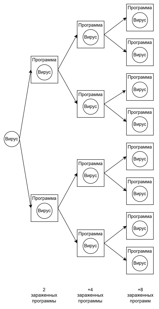 Так происходит лавинообразное распространение вируса, если каждая копия вируса создаст по две дополнительных копии: